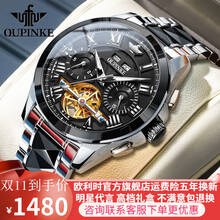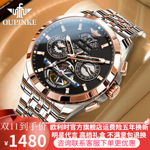 欧品客手表男机械表镂空机械多功能男士手表全自动手表夜光防水高档男表 潮酷+钢带玫黑男